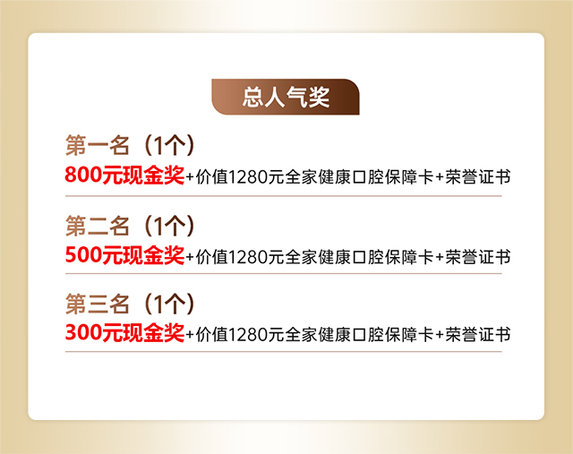 在活动期间,开放“小组赛人气奖”、“总决赛人气奖”、“总人气奖"线上投票通道,每个小组(10个)投票数最高的前了名、总决赛投票数最高的前了名总人气奖投票数最高的前了名可获此奖项。每人每天可投5票,禁止刷票。投票结束后,将于深圳德贝美口腔举办“最佳人气奖"颁奖仪式,现场颁发荣誉证书及现金红包。